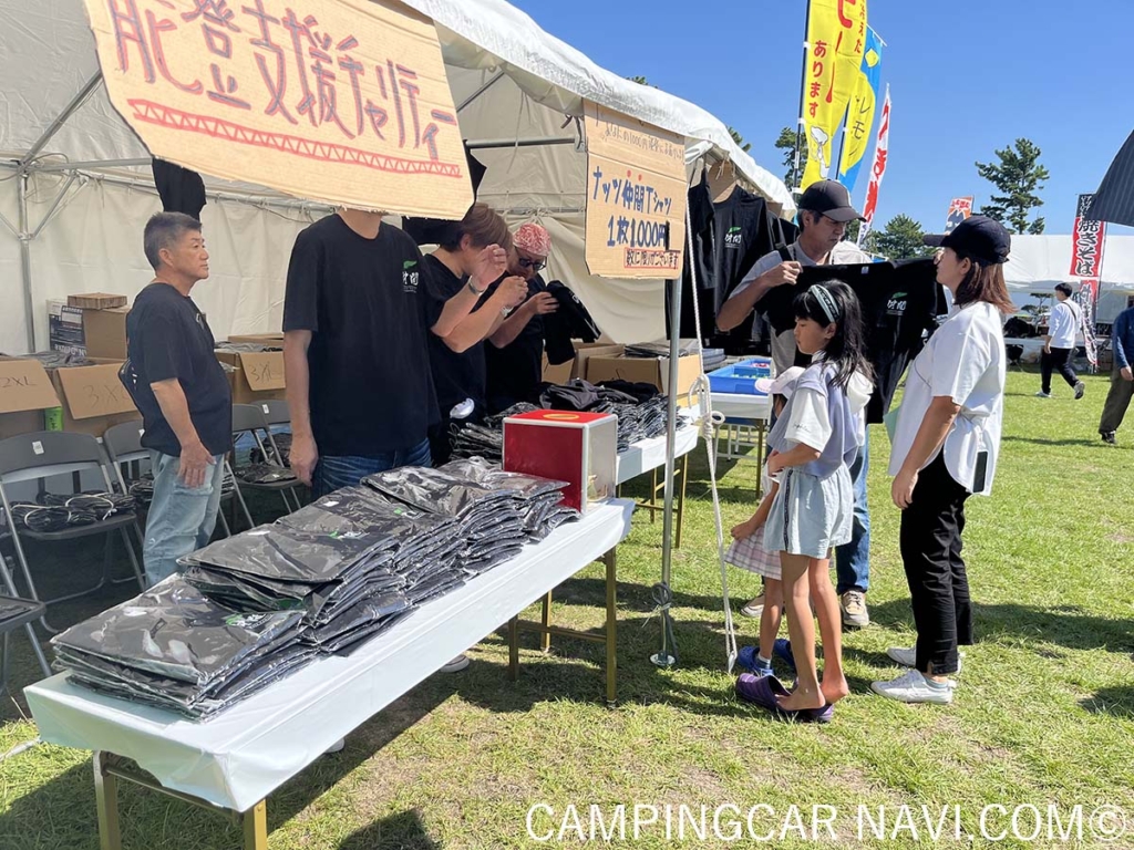 今回の義援金は、被災地支援の一環としてナッツRVが昨年の秋からイベントやオンラインで販売したチャリティTシャツの売上金です。活動に賛同するキャンピングカーユーザーに購入してもらいました。約5か月間で1,344枚ものTシャツを購入してもらい、当初の目標金額であった100万円を大きく超えることができました。