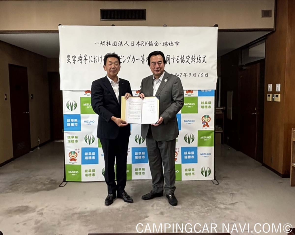 2025年9月10日に岐阜県瑞穂市が、災害時におけるキャンピングカーの提供に関する協定を日本RV協会と結びました!